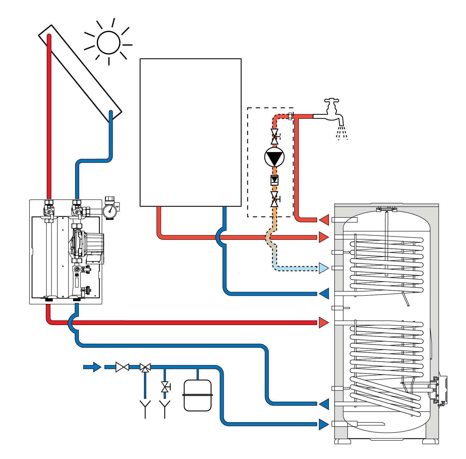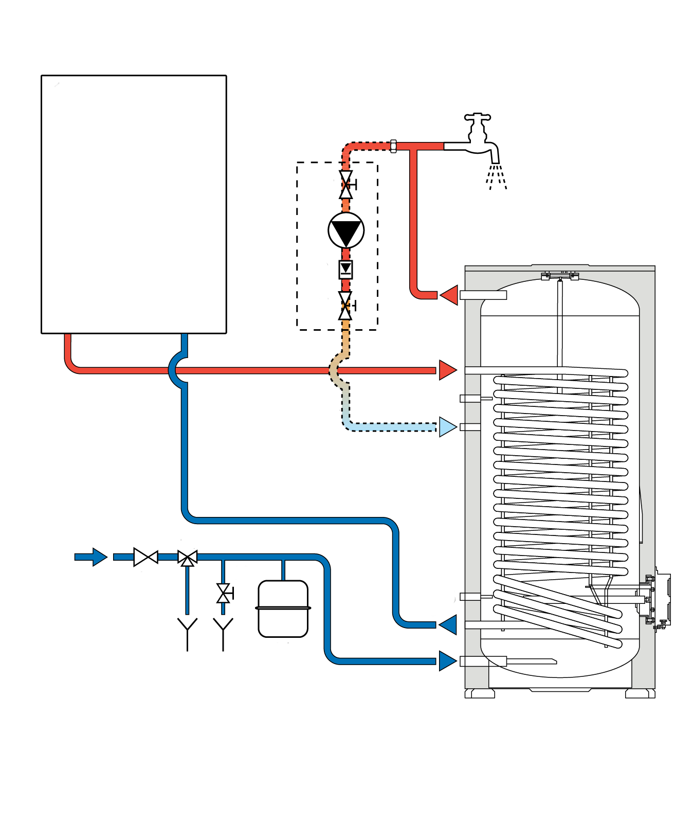 Бойлер использует тепло от системы отопления – горячая вода из котла циркулирует по змеевику, нагревая воду в баке.